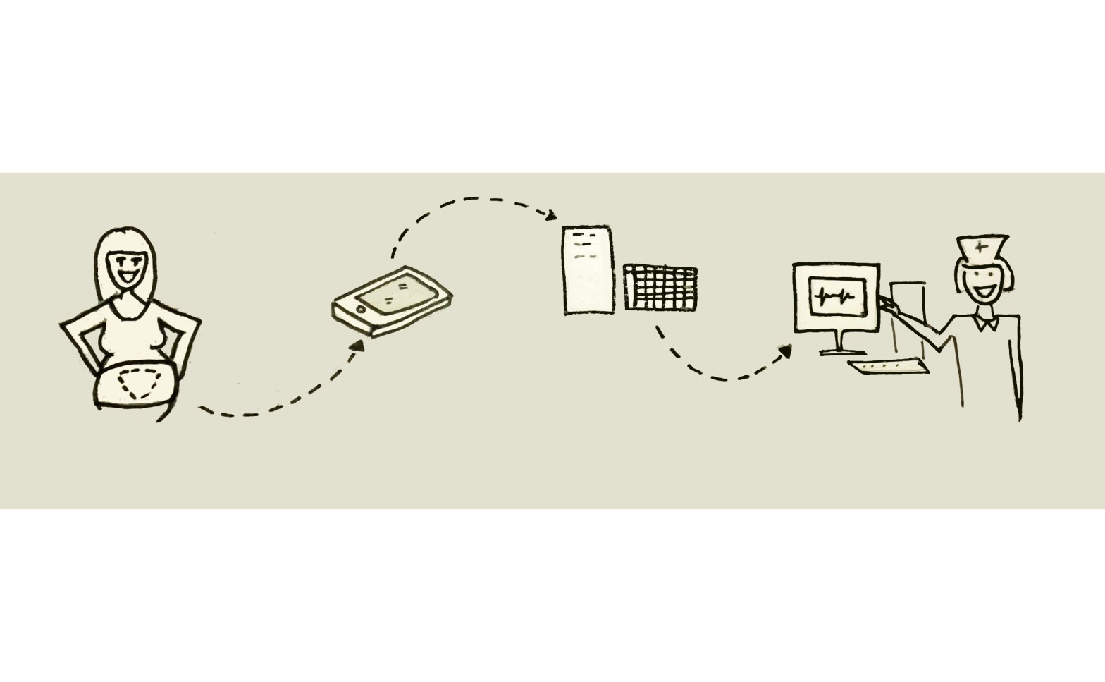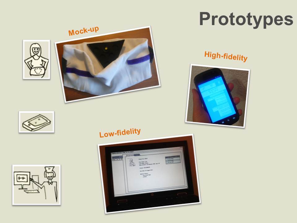 During the first phase of this project, I performed a background study in order to get acquainted with the field of pregnancy monitoring and to get up to date with the work of the MSM and SPS groups. In the next phase I explored the design space; several possible scenarios of use of a pregnancy monitoring system were assumed by individual brainstorming, which I then refined to five concepts. I continued with user research, by conducting interviews with gynecologists and pregnant women in order to gather user requirements and understand the user perspectives. Based on the findings of this research and the recommendations of the users, I proposed a final concept. This concept regards a monitoring system that consists of a monitoring belt, a mobile application for the mother, a back-end server with database and a desktop application for the caregiver with two different configurations for different monitoring purposes. Based on this concept three prototypes were created; a mock-up prototype of the monitoring belt, a low-fidelity prototype of the desktop application for the caregiver and a high-fidelity prototype of an Android mobile application for the mother. A user study followed in order to evaluate one of the two configurations of the proposed system and in specific the usability of the mobile application. The users (mothers and fathers) appreciated the potential use of the system and more specific, they thought that it would make the exchange of information with the caregiver easier. The mobile application was considered to be mother-friendly, clear and simple to understand.