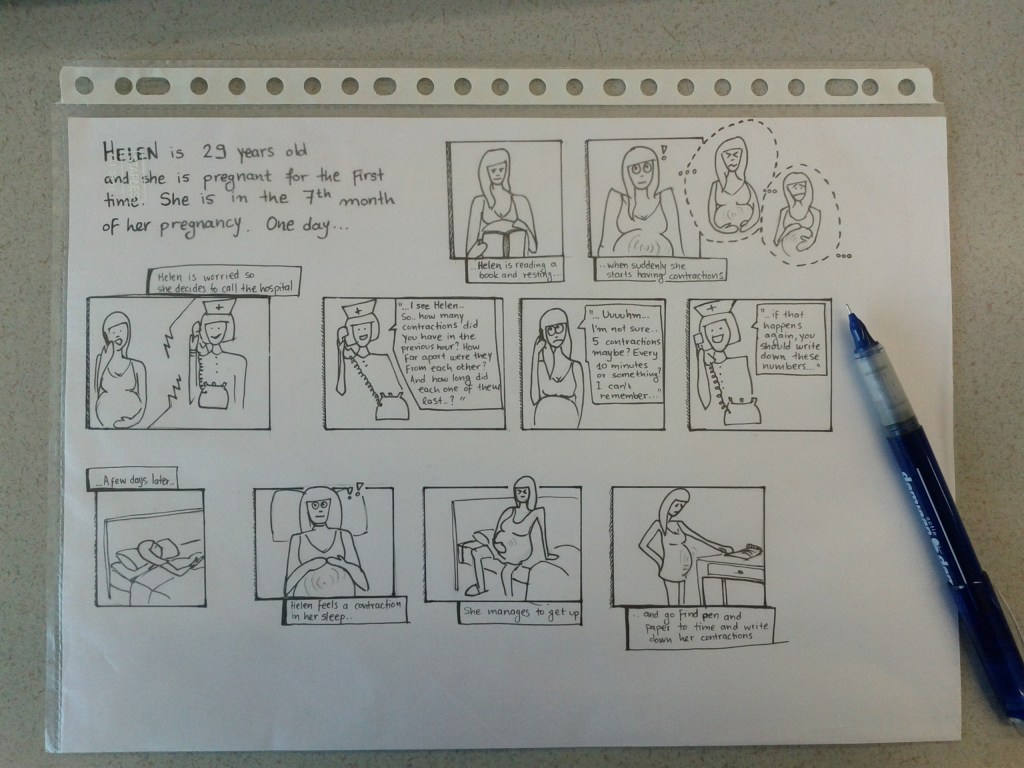 During the first phase of this project, I performed a background study in order to get acquainted with the field of pregnancy monitoring and to get up to date with the work of the MSM and SPS groups. In the next phase I explored the design space; several possible scenarios of use of a pregnancy monitoring system were assumed by individual brainstorming, which I then refined to five concepts. I continued with user research, by conducting interviews with gynecologists and pregnant women in order to gather user requirements and understand the user perspectives. Based on the findings of this research and the recommendations of the users, I proposed a final concept. This concept regards a monitoring system that consists of a monitoring belt, a mobile application for the mother, a back-end server with database and a desktop application for the caregiver with two different configurations for different monitoring purposes. Based on this concept three prototypes were created; a mock-up prototype of the monitoring belt, a low-fidelity prototype of the desktop application for the caregiver and a high-fidelity prototype of an Android mobile application for the mother. A user study followed in order to evaluate one of the two configurations of the proposed system and in specific the usability of the mobile application. The users (mothers and fathers) appreciated the potential use of the system and more specific, they thought that it would make the exchange of information with the caregiver easier. The mobile application was considered to be mother-friendly, clear and simple to understand.