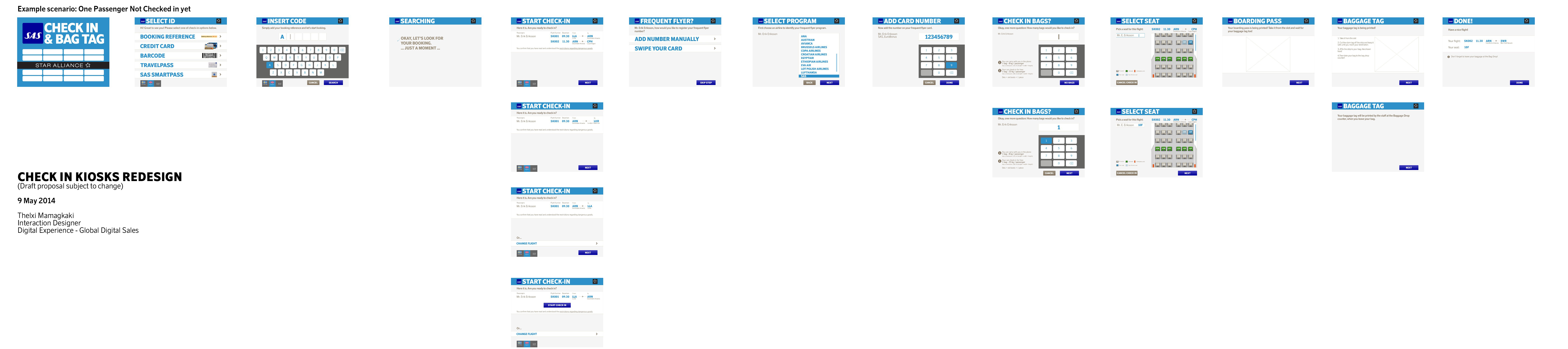 My main job was to redesign the UI of the SAS self service check-in kiosks to cater for a better UX and give it a new, refreshed SAS look. Moreover I had to design the flows for the new features that will come in the future to offer ancillary services and payment.