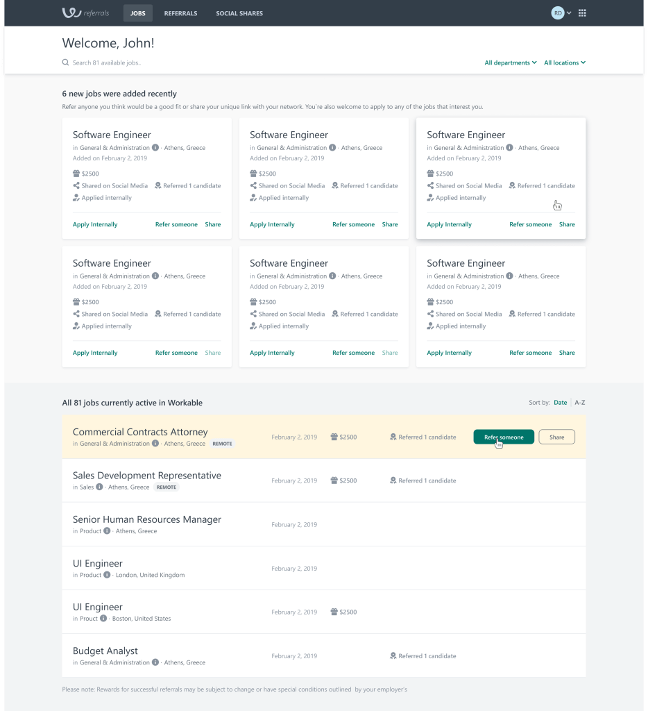 Our goal with this project was to give Workable customers the option to create an employee portal, next to Workable’s core product. There, company employees could view open jobs, share them with their network, refer people they know and also get the ability to apply for internal job openings themselves. The sourcing technologies that Workable had already developed for recruiters in the core product, could be reused to help employees in their referral process.