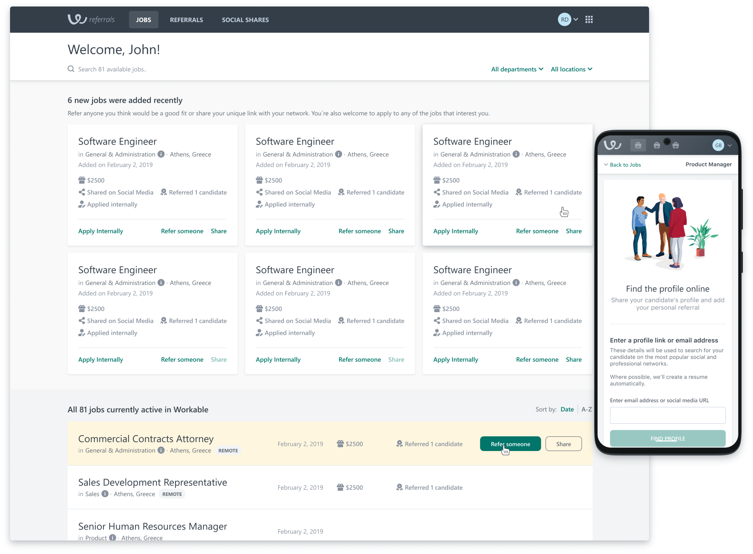 The Workable Referrals project dealt with building a platform for company employees, where they can view all the jobs their company is hiring for, share these jobs with their network, refer their connections and apply for jobs that are hiring internally. This platform offers Workable customers a tool to invite their employees in sourcing high quality candidates in an engaging way.